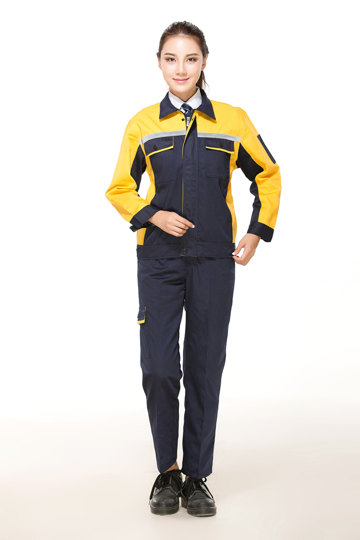 淮南工作服定做款式藏青色拼黃色長(zhǎng)袖工作服套裝GZ-8015