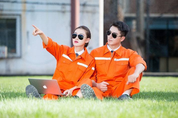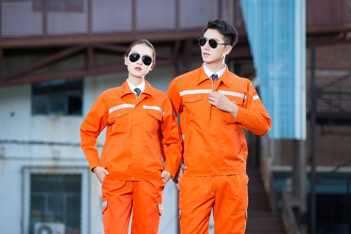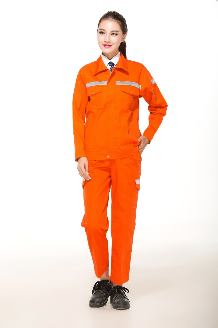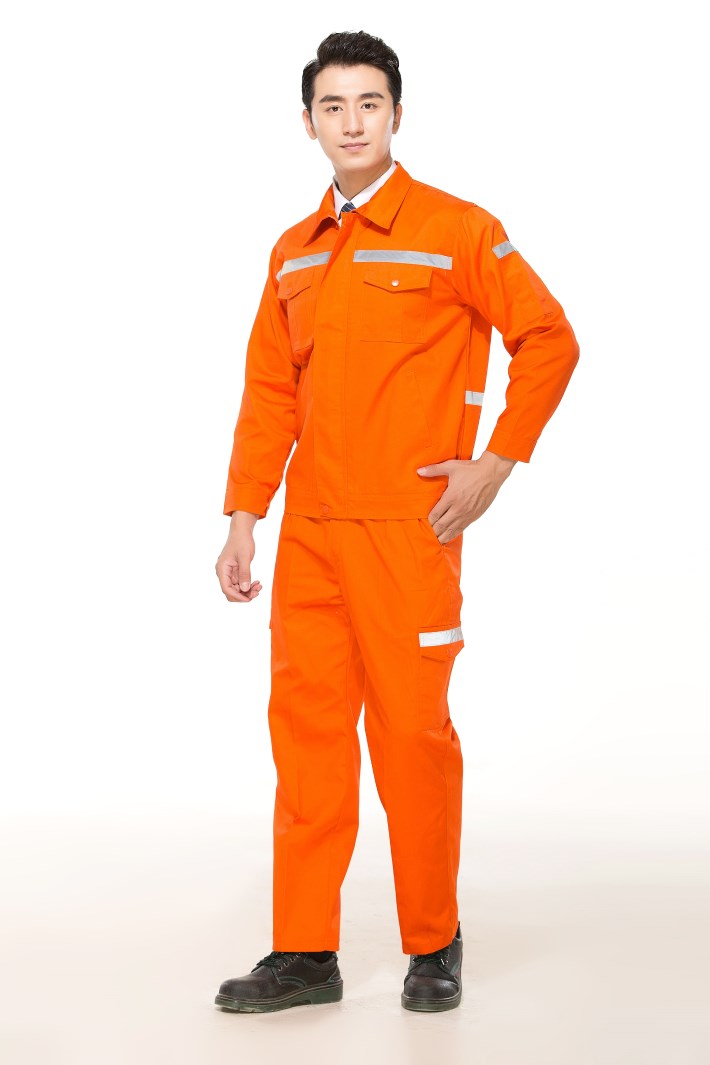 合肥廬江縣工作服定做款式廠家推薦橘黃色工程服環(huán)衛(wèi)勞保服GZ-8009