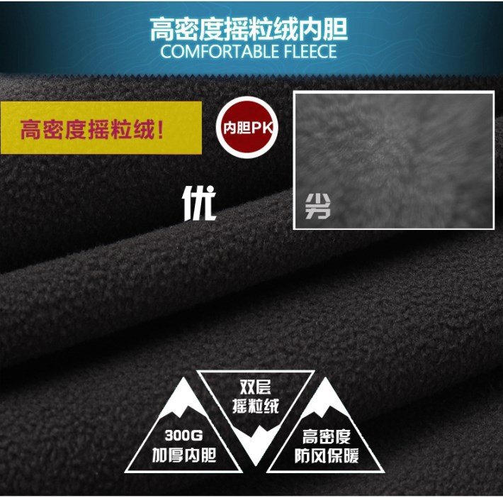 產(chǎn)品成分: 春亞紡PU圖層、搖粒絨內(nèi)膽