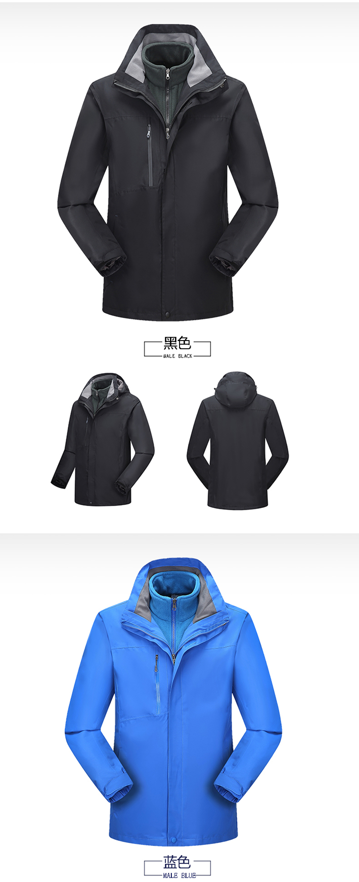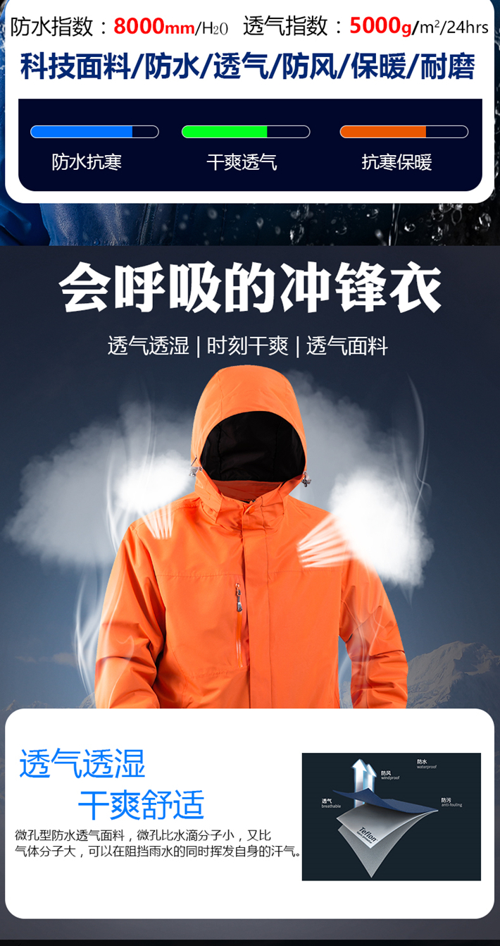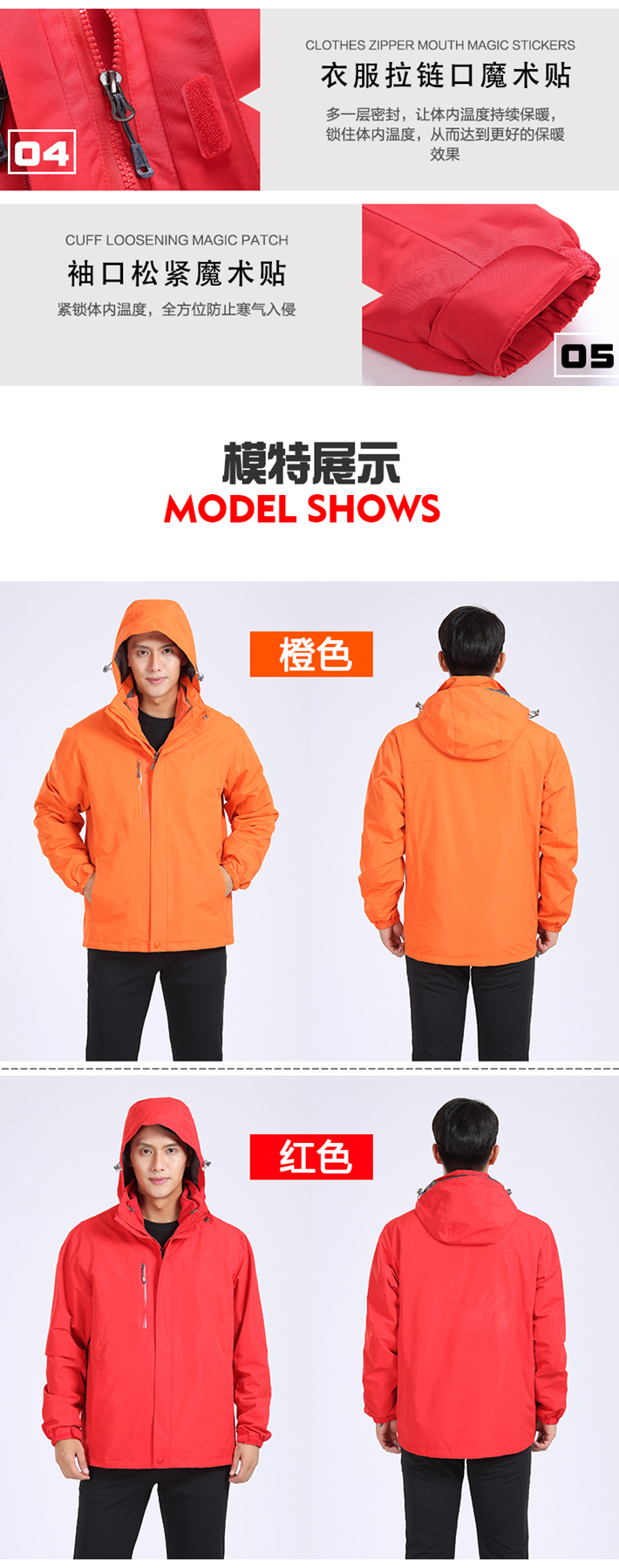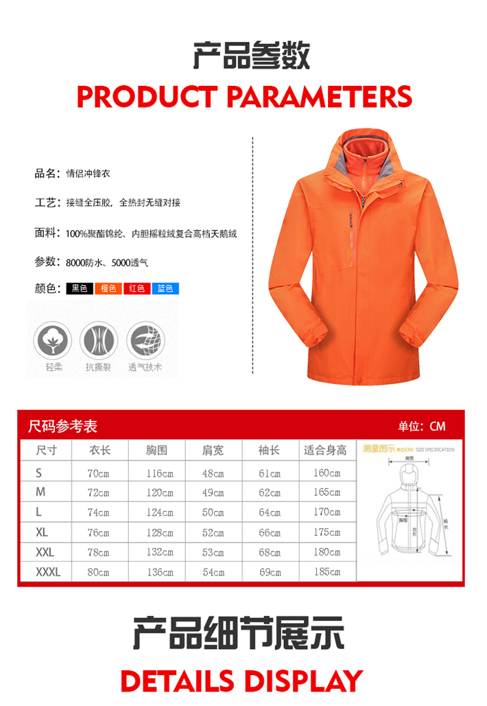 生產(chǎn)工藝:采用拉鏈壓膠防水工衣,可拆卸內(nèi)膽、袖口松緊魔術(shù)貼
