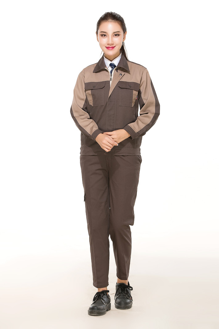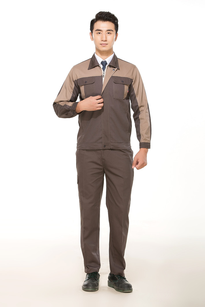 全棉紗卡卡其色拼灰色拉鏈?zhǔn)焦ぷ鞣L(zhǎng)袖套裝GZ-8023