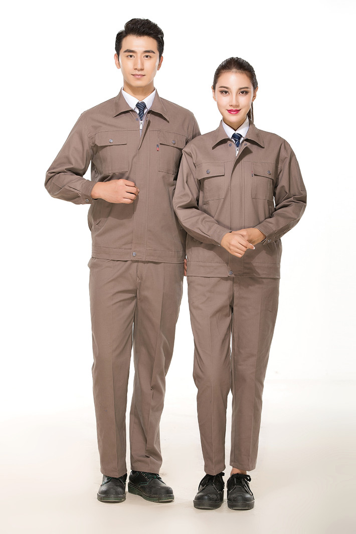全棉紗卡卡其色拉鏈?zhǔn)焦ぷ鞣L袖套裝GZ-QM8022