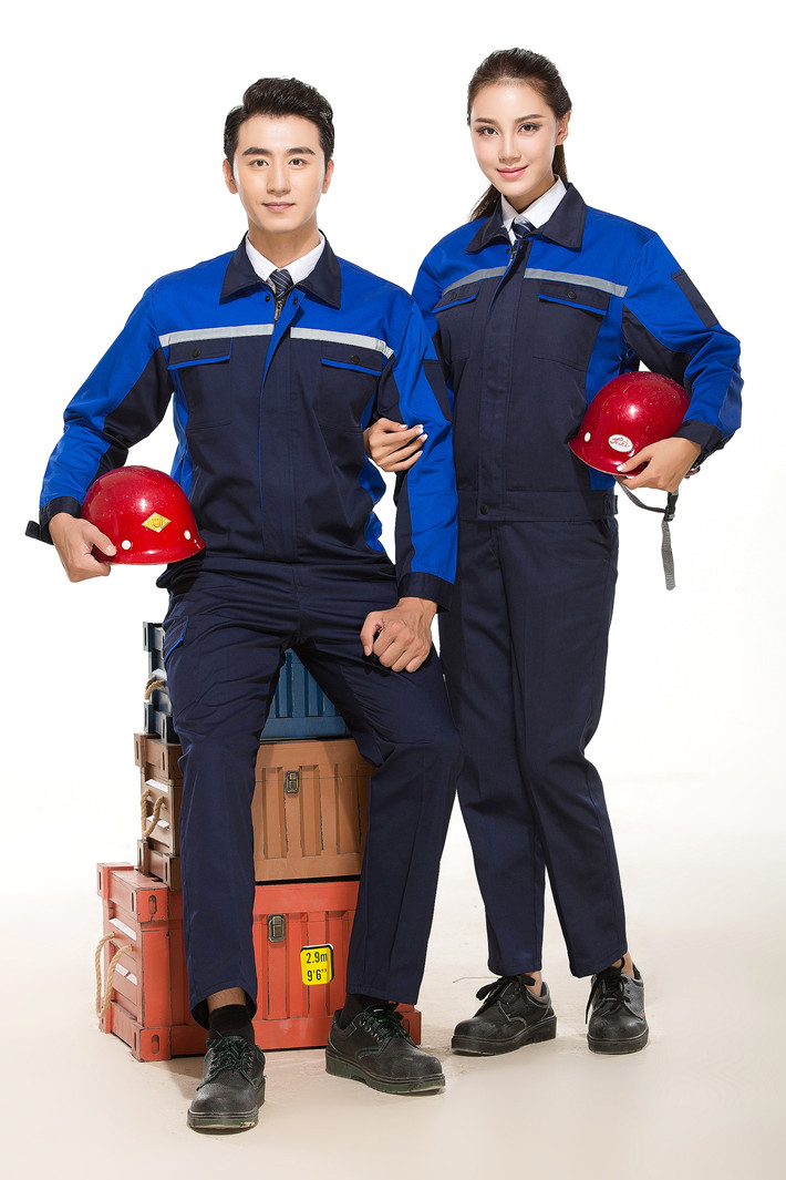 滌棉藏青色拼藍(lán)色反光條工作服套裝GZ-DM8011
