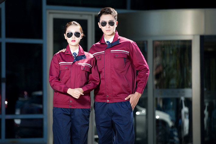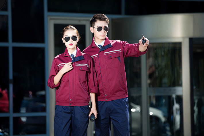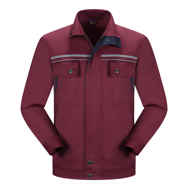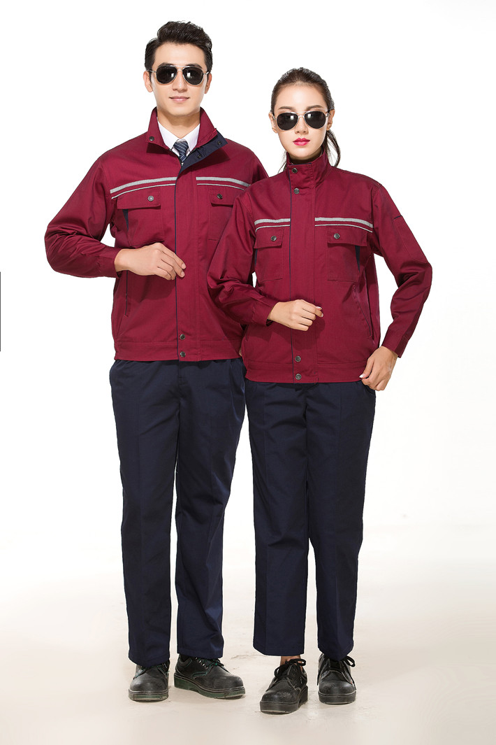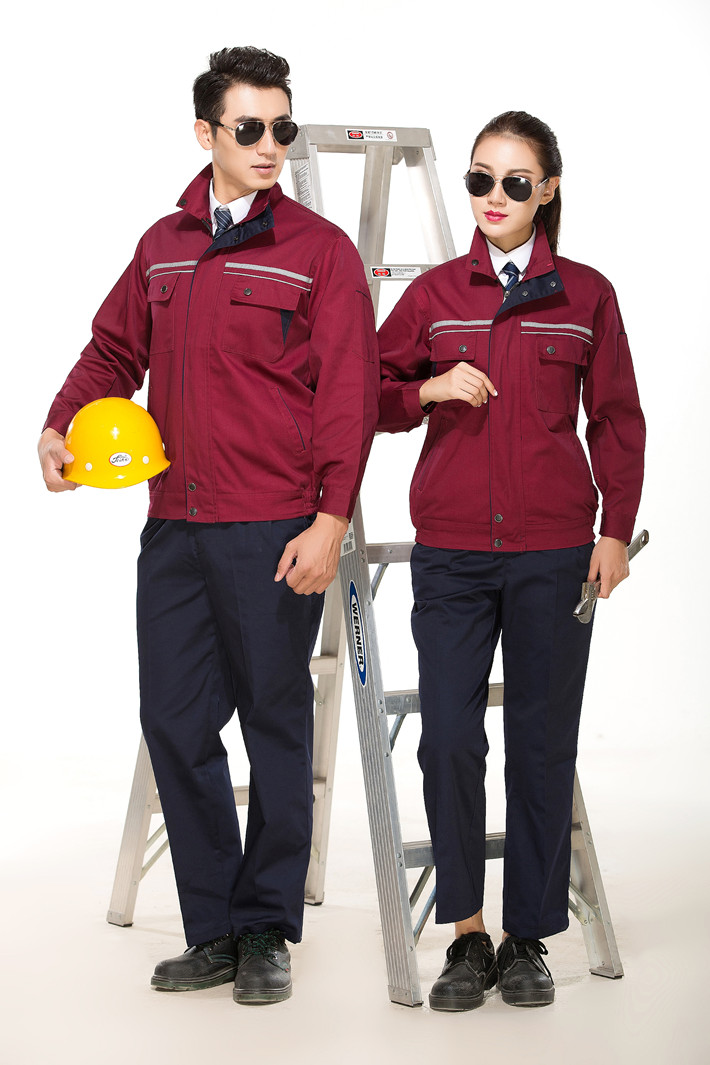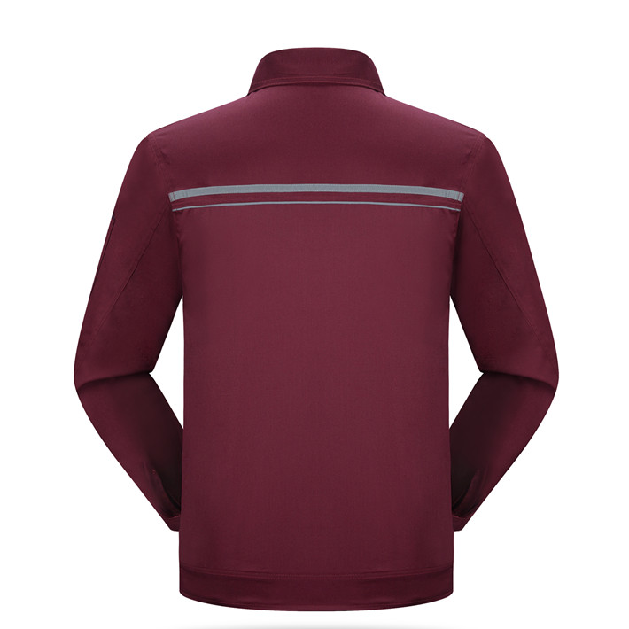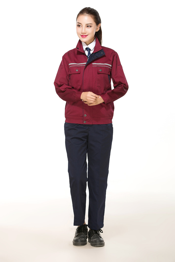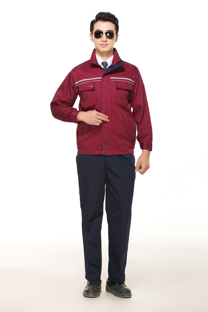 滌棉棗紅色立領(lǐng)拼色拉鏈?zhǔn)椒垂鈼l工作服長(zhǎng)袖套裝GZ-FGT8028